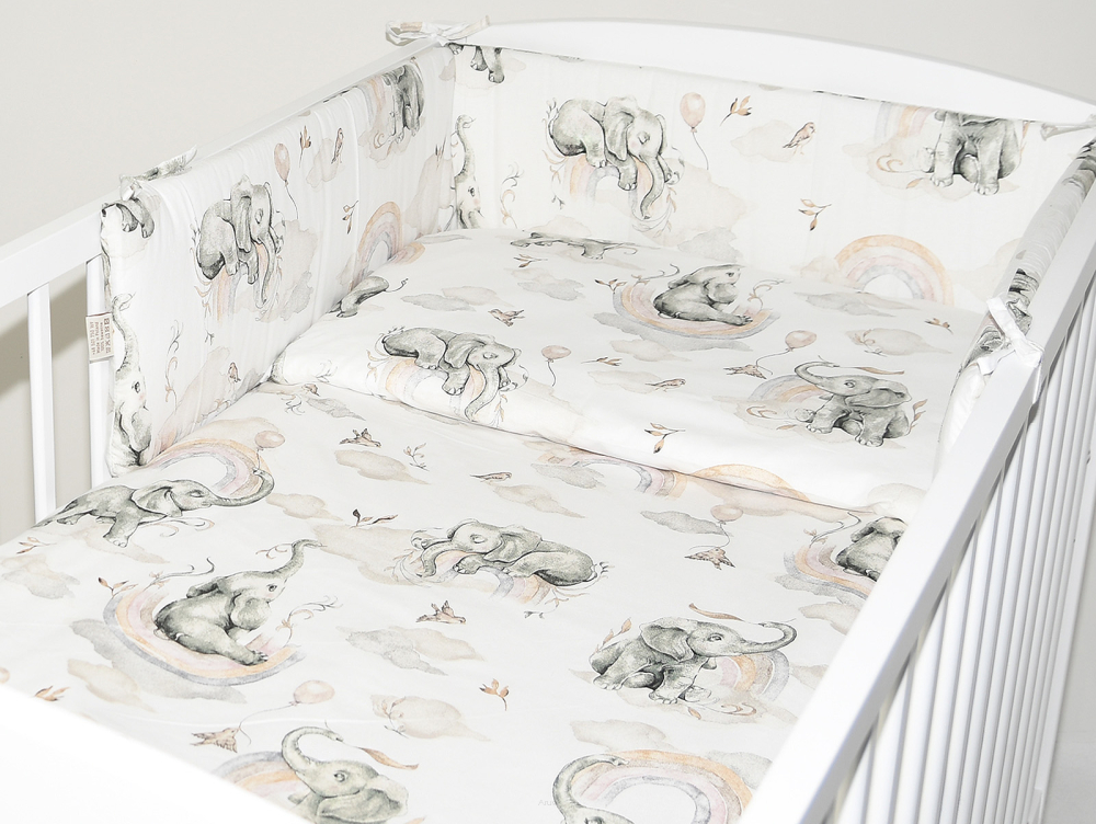 Päťdielna súprava do postieľky vyrobená z vysokokvalitnej bavlnenej látky.