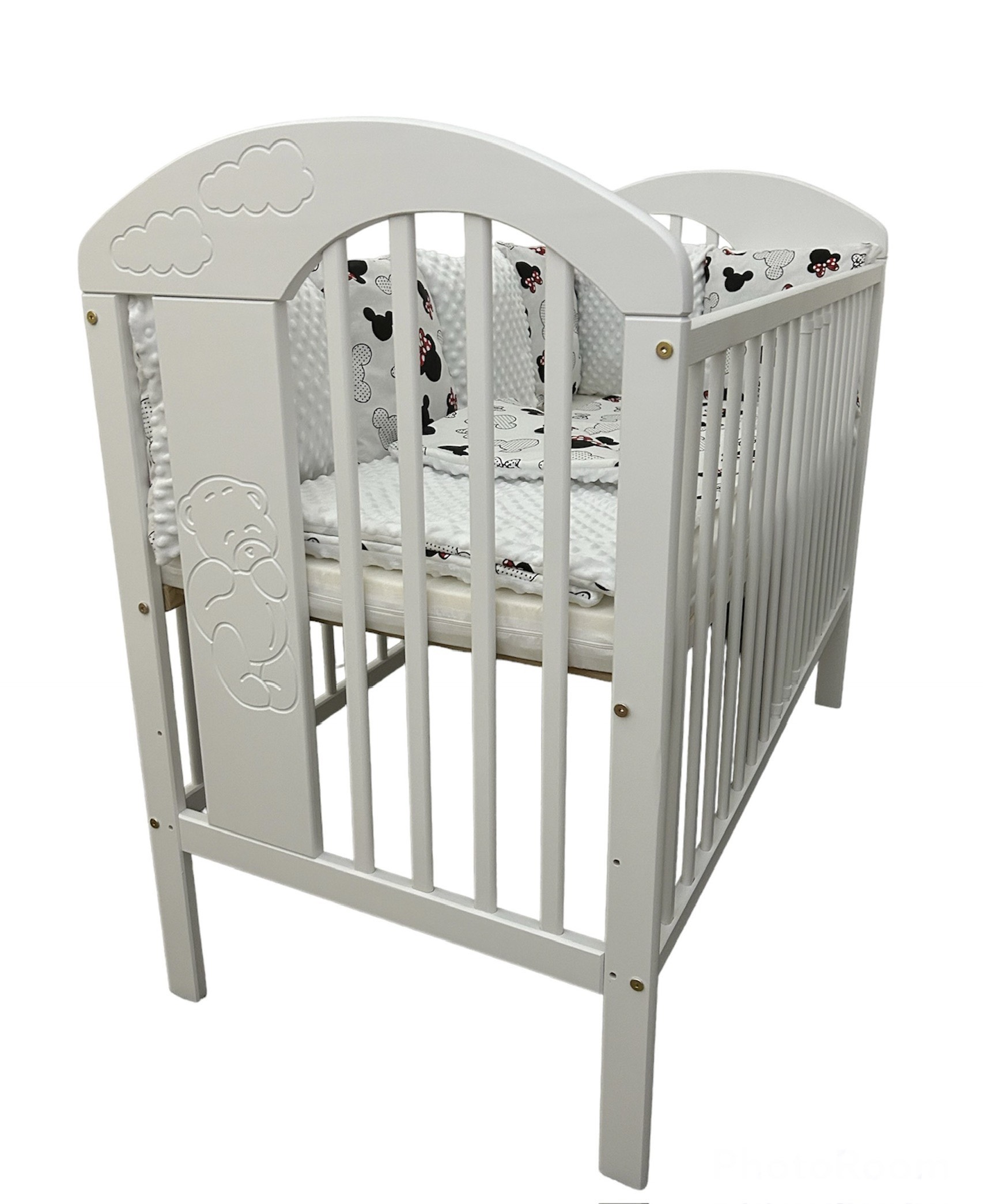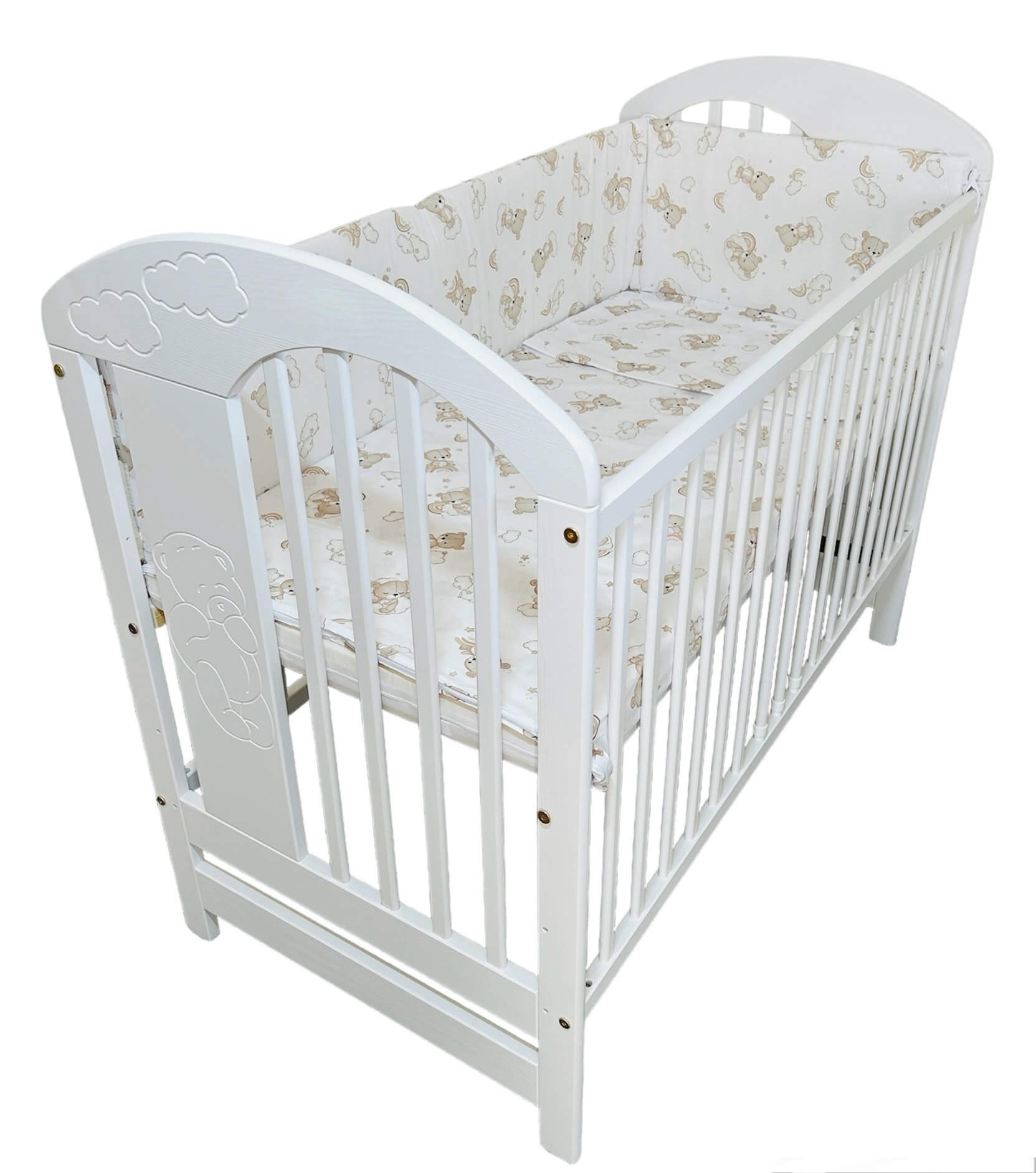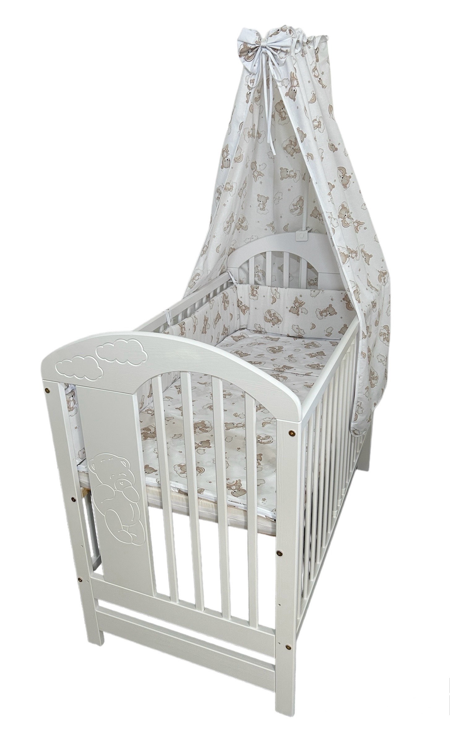 Vysokokvalitná detská postieľka farba biela s vyrezaným obrázkom Macíka na jednom čele.
