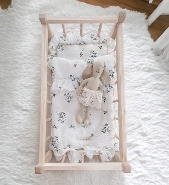 Kolíska / postieľka pre bábiky s mušelínovou romantickou súpravou posteľnej bielizne