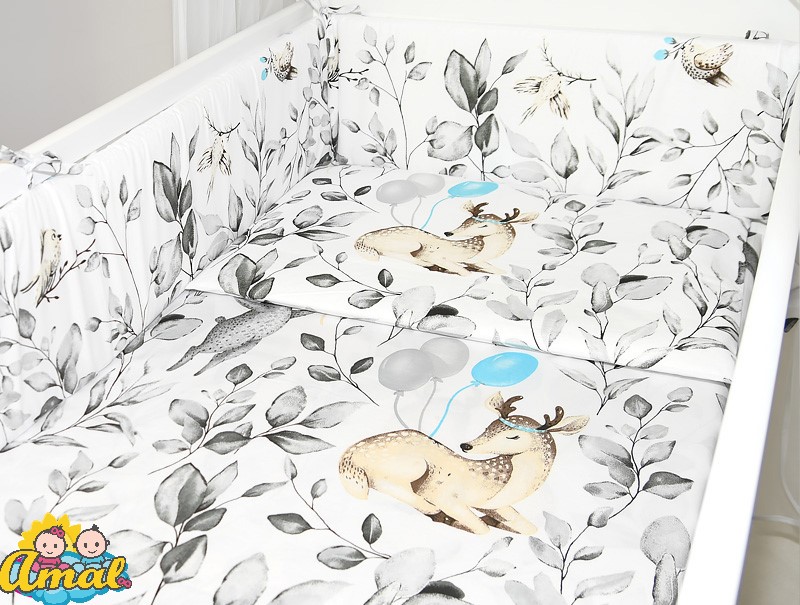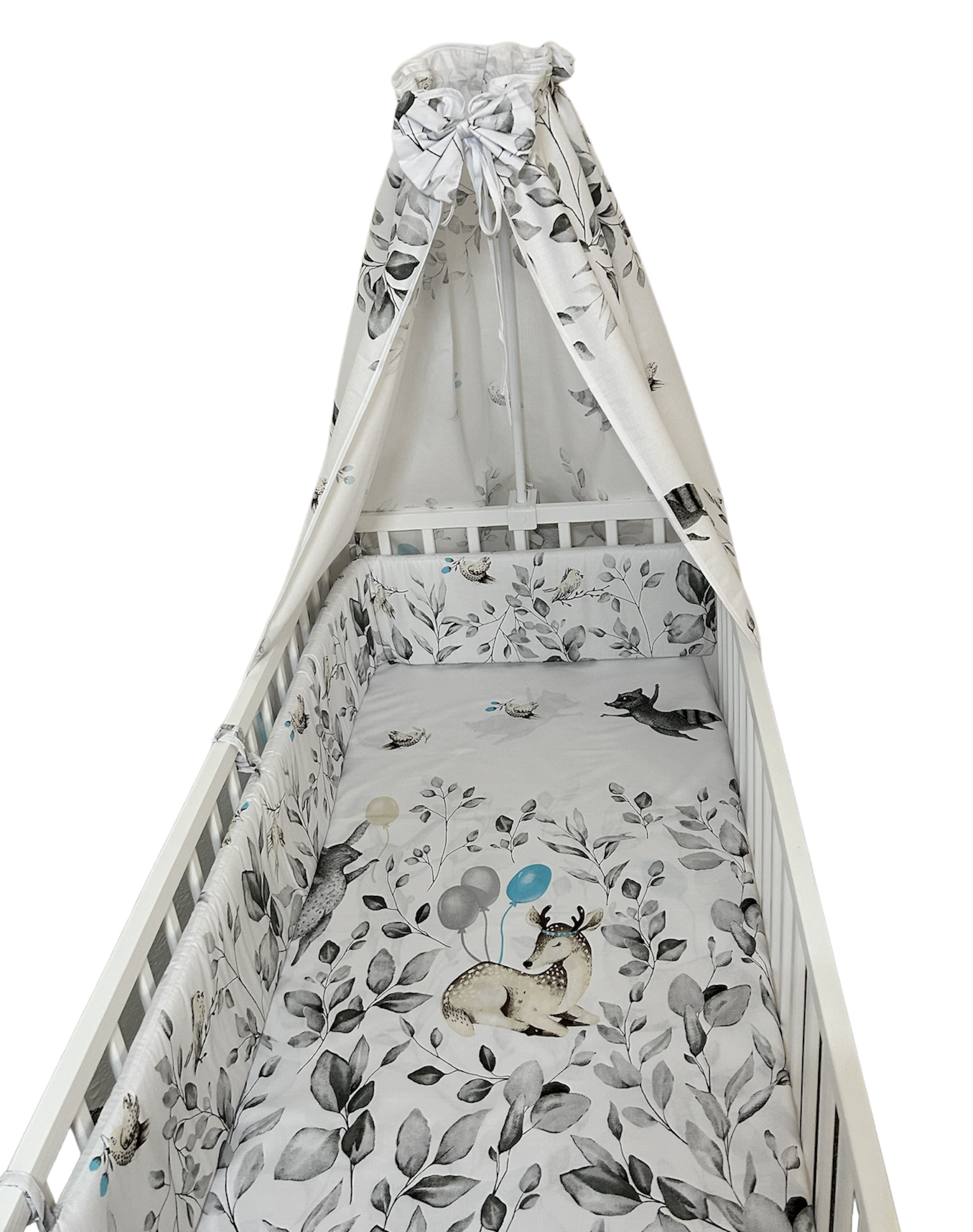 • mantinel za hlavičku, rozmer 180x20cm - ideálna ochrana hlavičky dieťatka, výplň tvorí antialergická, až 2 cm hrubá pena, ktorá svojou tuhosťou zabezpečuje, aby mantinel pevne stál okolo postieľky a nevlnil sa. Poťah mantinelu je snímateľný pre lepšie pranie, o postieľku sa priväzuje pomocou prišitých šnúrok v tom istom odtieni ako látka.