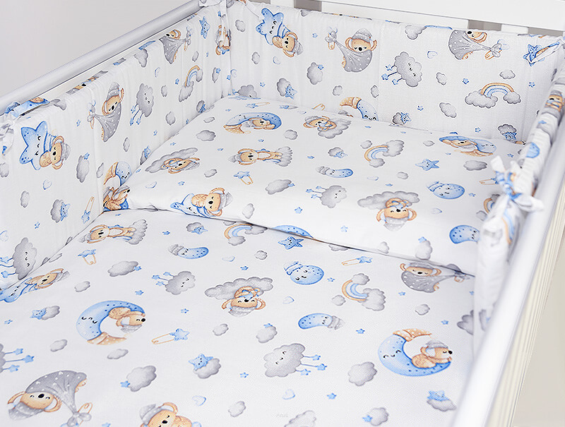 • mantinel za hlavičku, rozmer 180x20cm - ideálna ochrana hlavičky dieťatka, výplň tvorí antialergická, až 2 cm hrubá pena, ktorá svojou tuhosťou zabezpečuje, aby mantinel pevne stál okolo postieľky a nevlnil sa. Poťah mantinelu je snímateľný pre lepšie pranie, o postieľku sa priväzuje pomocou prišitých šnúrok v tom istom odtieni ako látka.