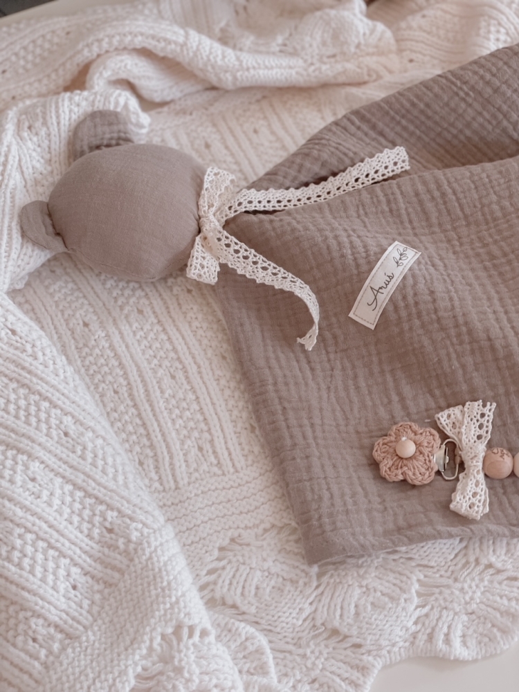 Detský látkový maznáčik je skvelým spoločníkom pre vaše dieťatko už od narodenia. Bude ho sprevádzať na cestách aj v postieľke. Jemný, mäkký materiál je pre detskú pokožku príjemný na dotyk. Zachováva vôňu domova, a tým dodáva dieťatku pocit bezpečia mimo na cestách alebo v neprítomnosti matky. Maznáčik je vyrobený zo 100 % z mušelínovej bavlny. Rozvíja zrak, koordináciu pohybov. Rozvíja dotykové zmysly a správny úchyt ručičiek.