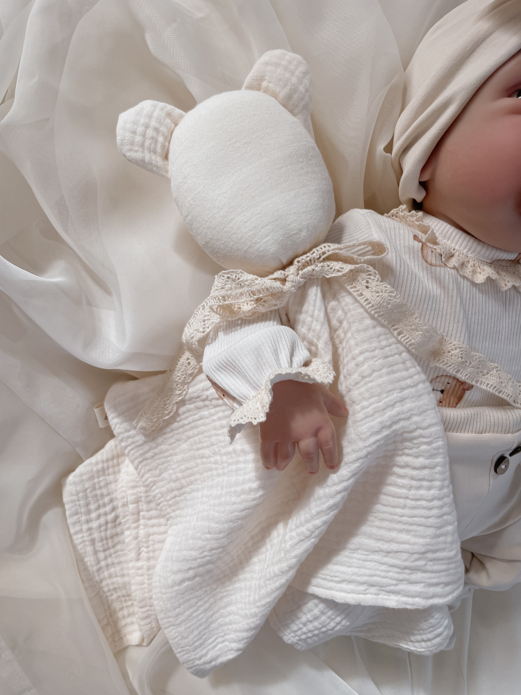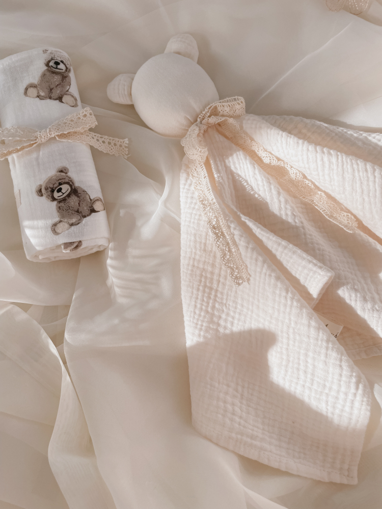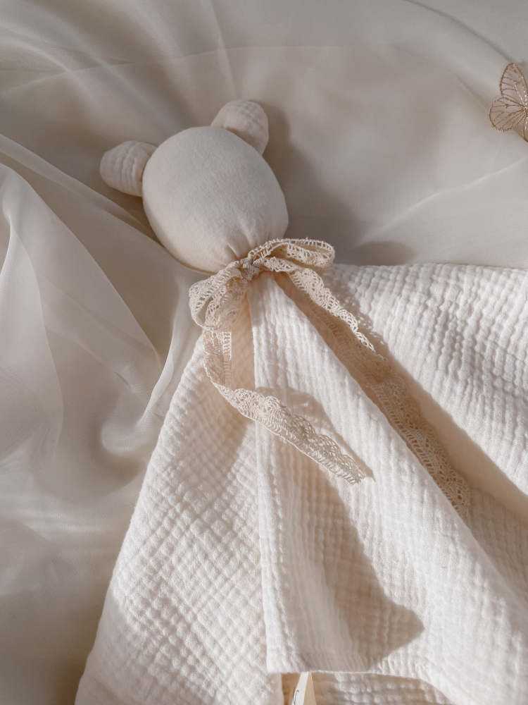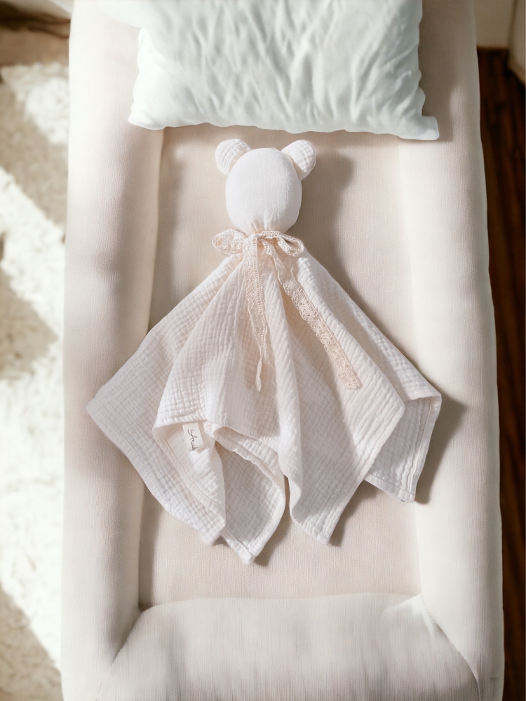 Detský látkový maznáčik je skvelým spoločníkom pre vaše dieťatko už od narodenia. Bude ho sprevádzať na cestách aj v postieľke. Jemný, mäkký materiál je pre detskú pokožku príjemný na dotyk. Zachováva vôňu domova, a tým dodáva dieťatku pocit bezpečia mimo na cestách alebo v neprítomnosti matky. Maznáčik je vyrobený zo 100 % z mušelínovej bavlny. Rozvíja zrak, koordináciu pohybov. Rozvíja dotykové zmysly a správny úchyt ručičiek.